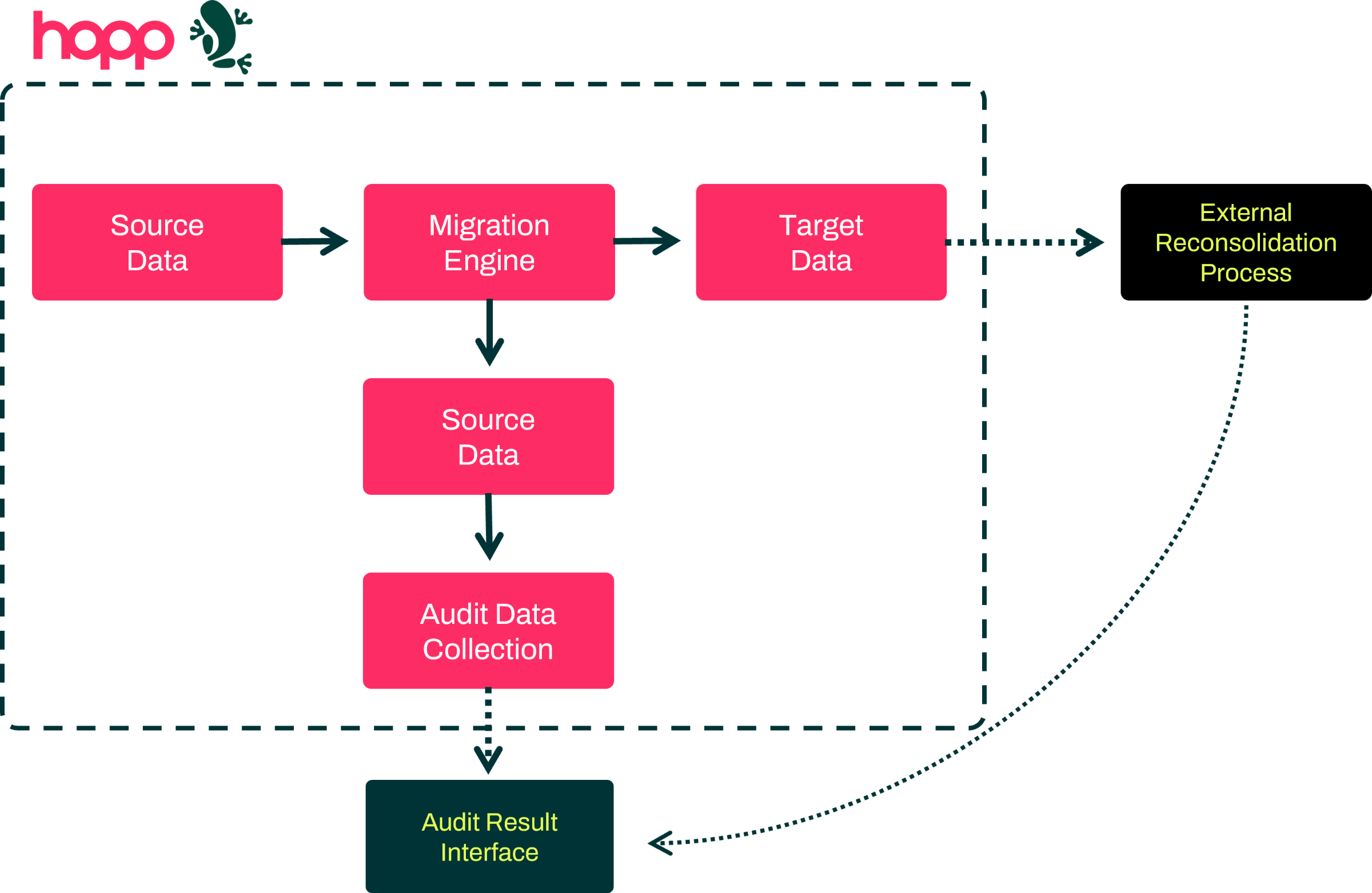 The diagram shows Hopp’s audit and reconciliation process: Source Data flows through the Migration Engine to Target Data. Audit Data Collection occurs during migration and feeds into the Audit Results Interface.